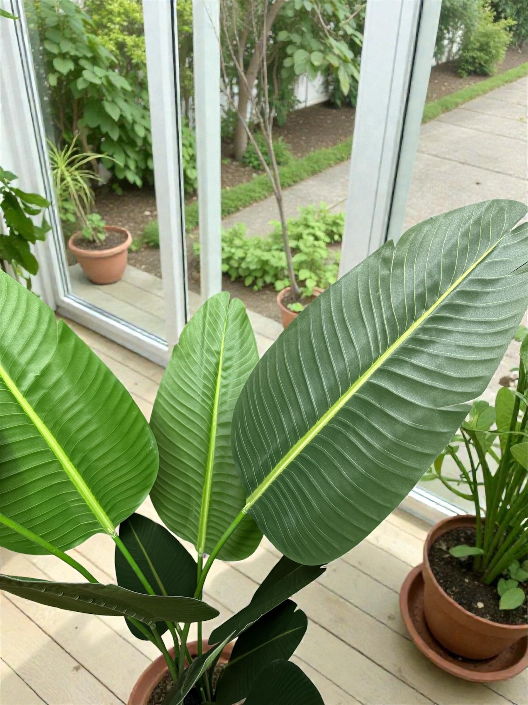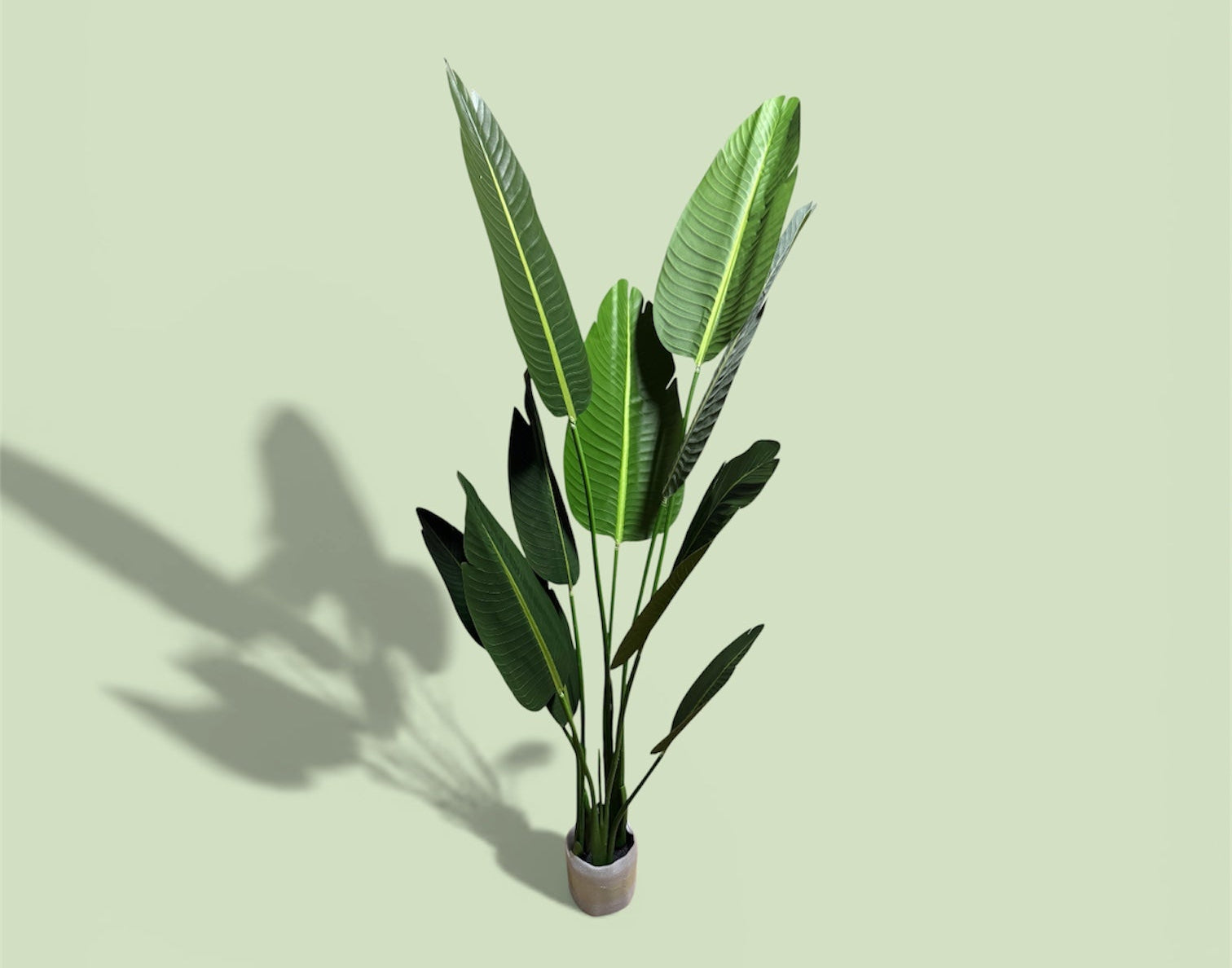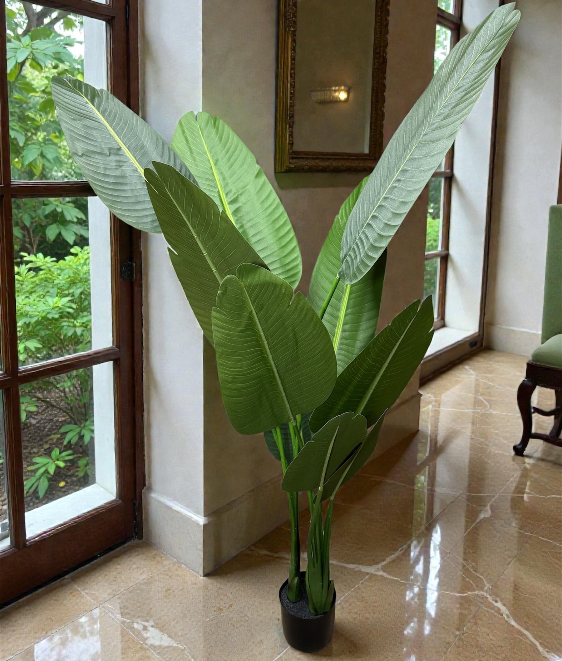 Albero del viaggiatore artificiale che riproduce fedelmente la maestosità della pianta esotica originaria del Madagascar.